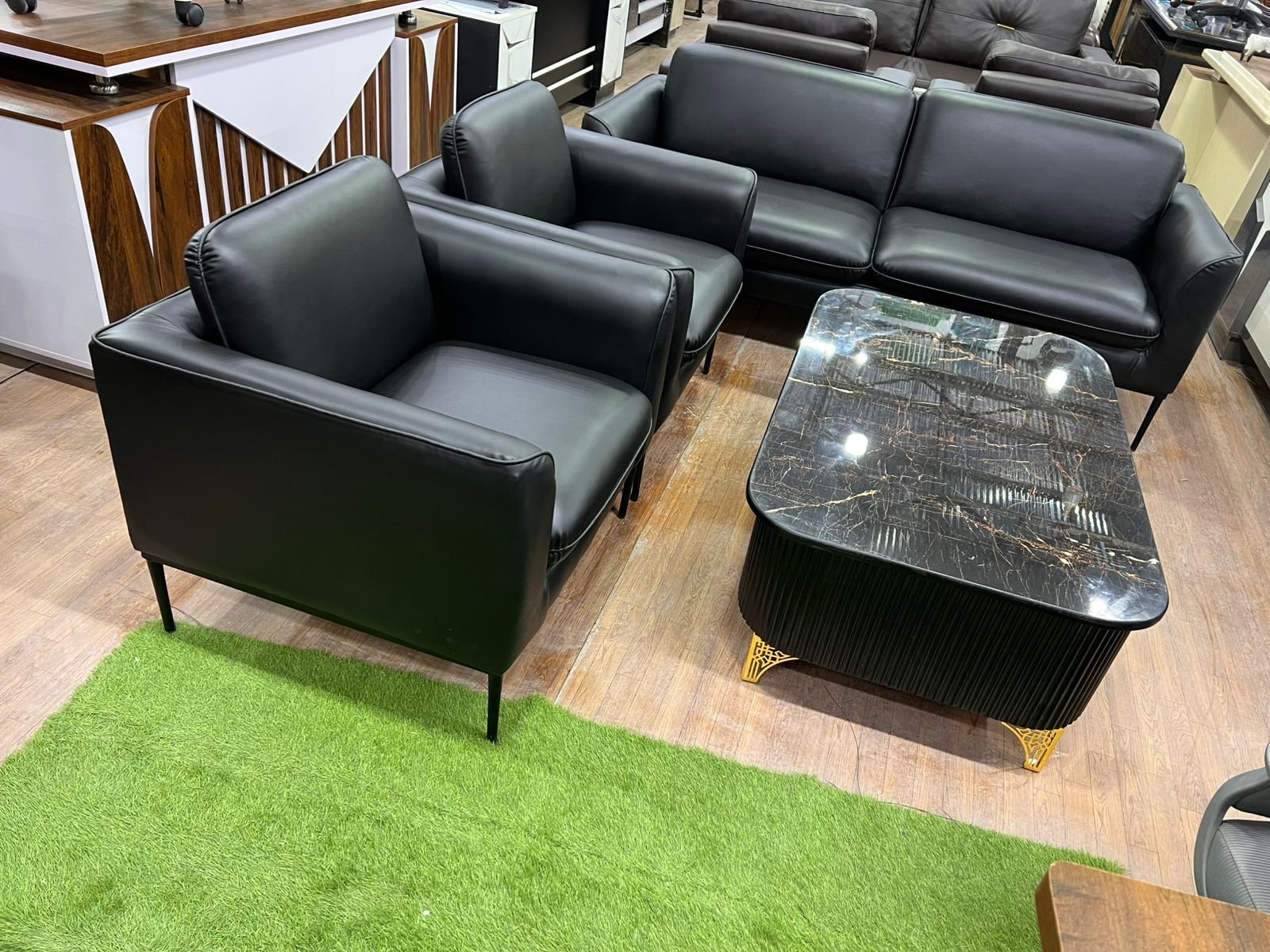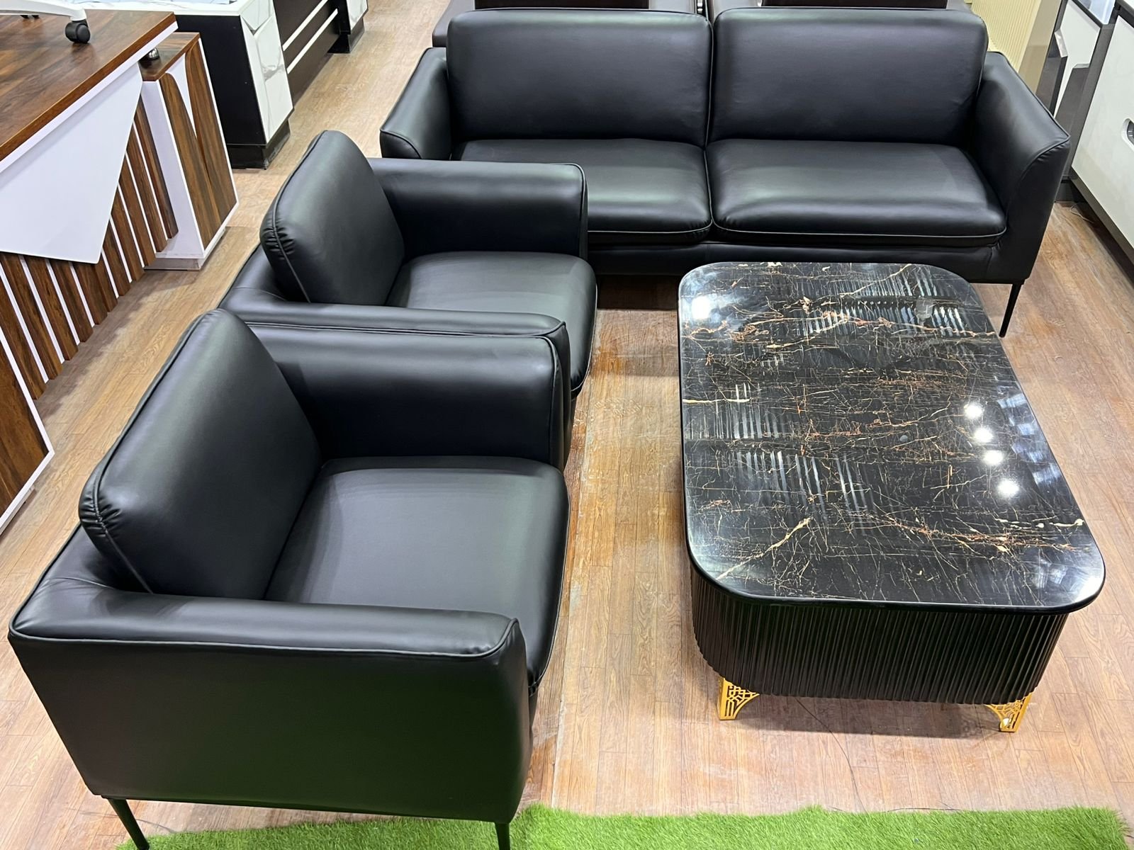 1. *تین نفرہ صوفہ*: ایک سیاہ چمڑے کا کاؤچ جس میں صاف، سیدھی آرمیسٹ اور بیک ریسٹ ہے، جو تین افراد کے لیے بنایا گیا ہے۔